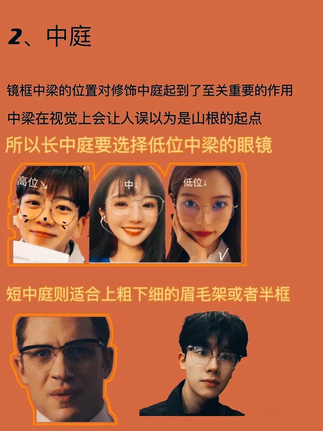 B、中梁视觉中心上移,切勿选择框高过高的。中庭偏短:则五官拥挤,或显得脸短,可以高位